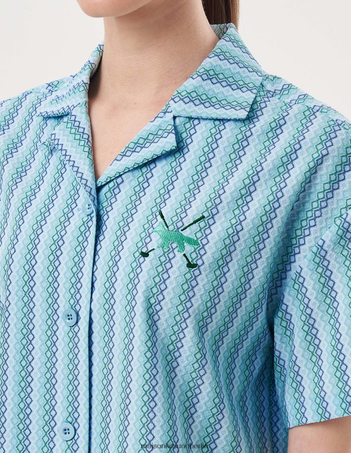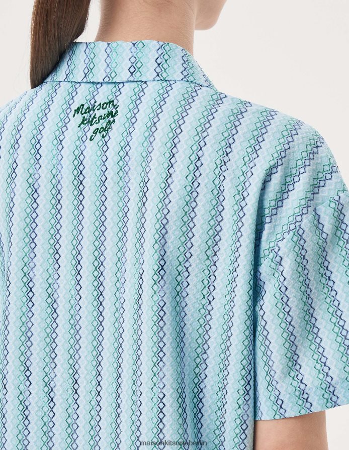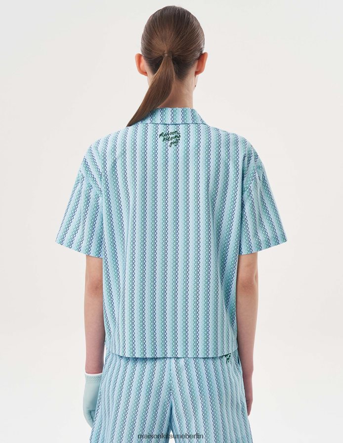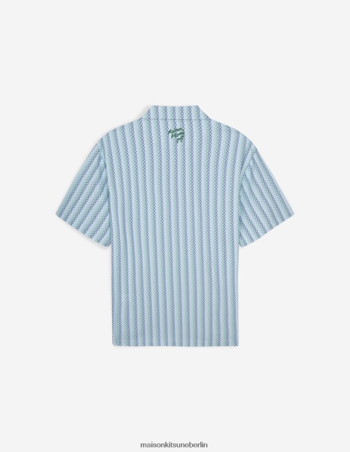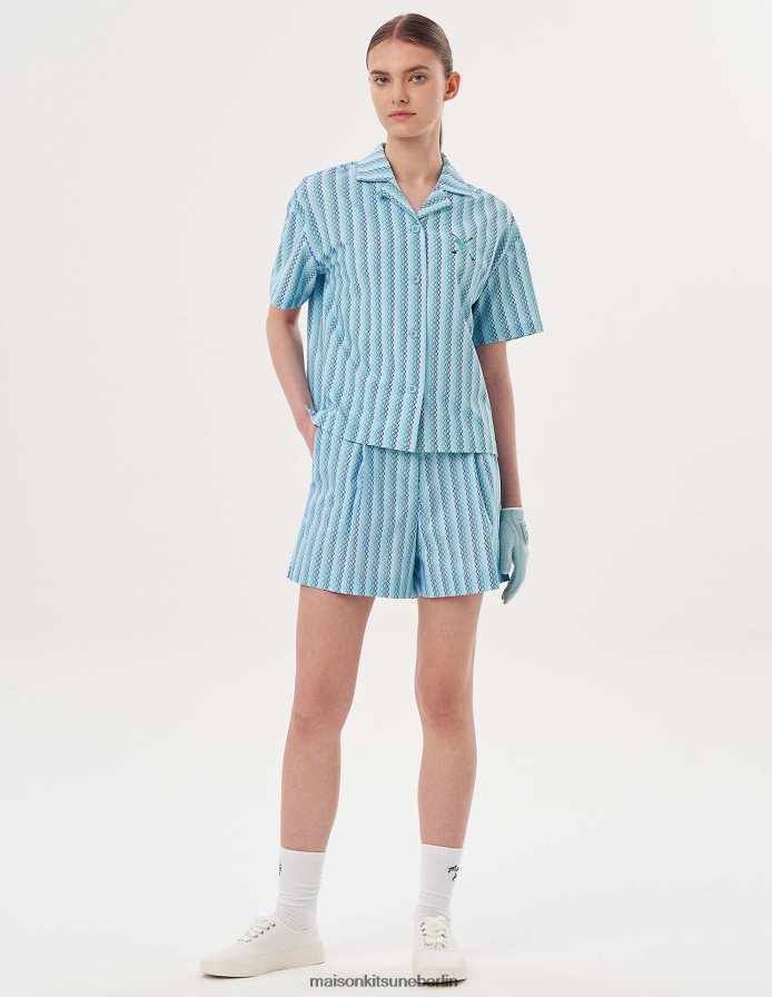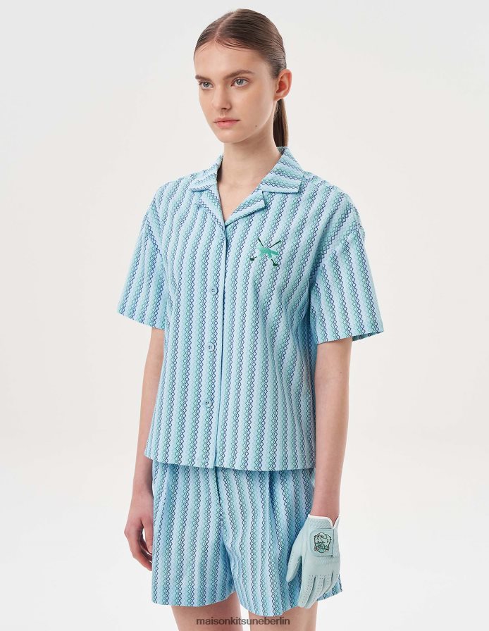 Kleidung V2DHL458 Himmelblau Frauen Profile Fox Diamantstreifen-Kurzarmshirt Maison Kitsune
